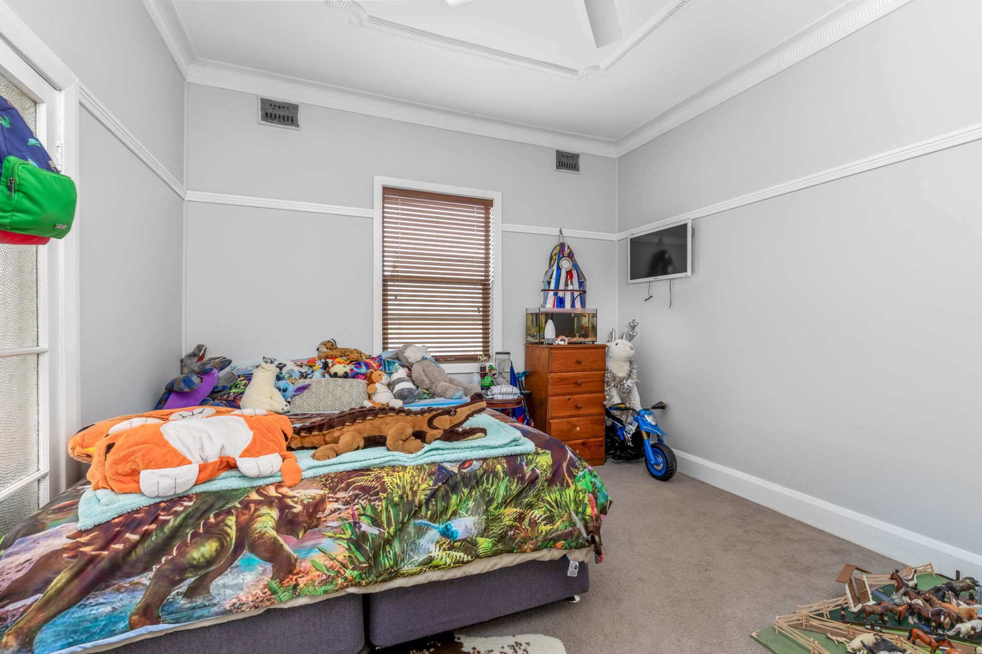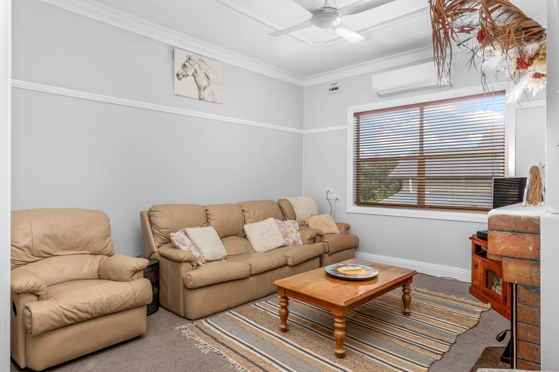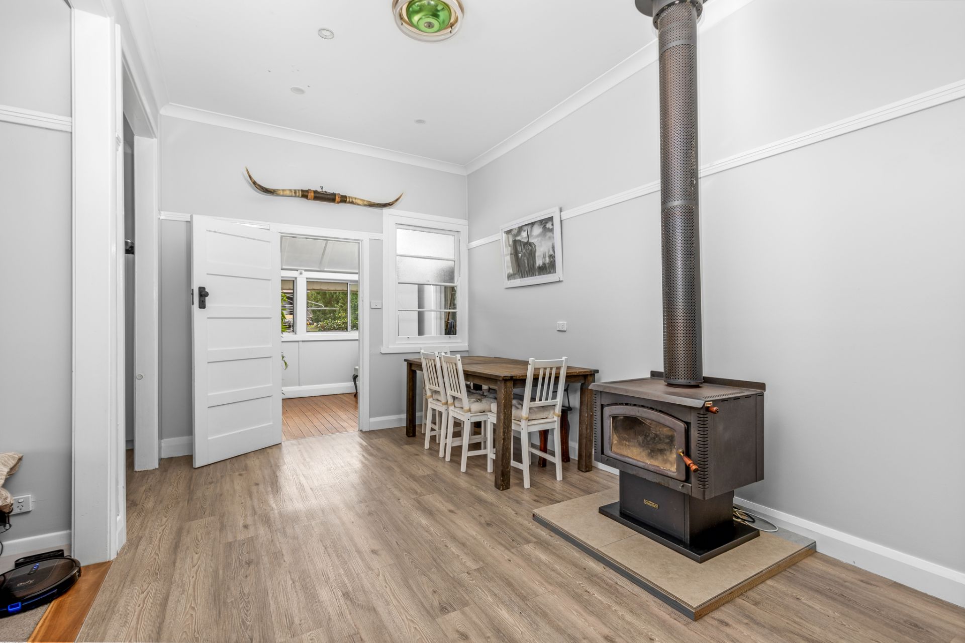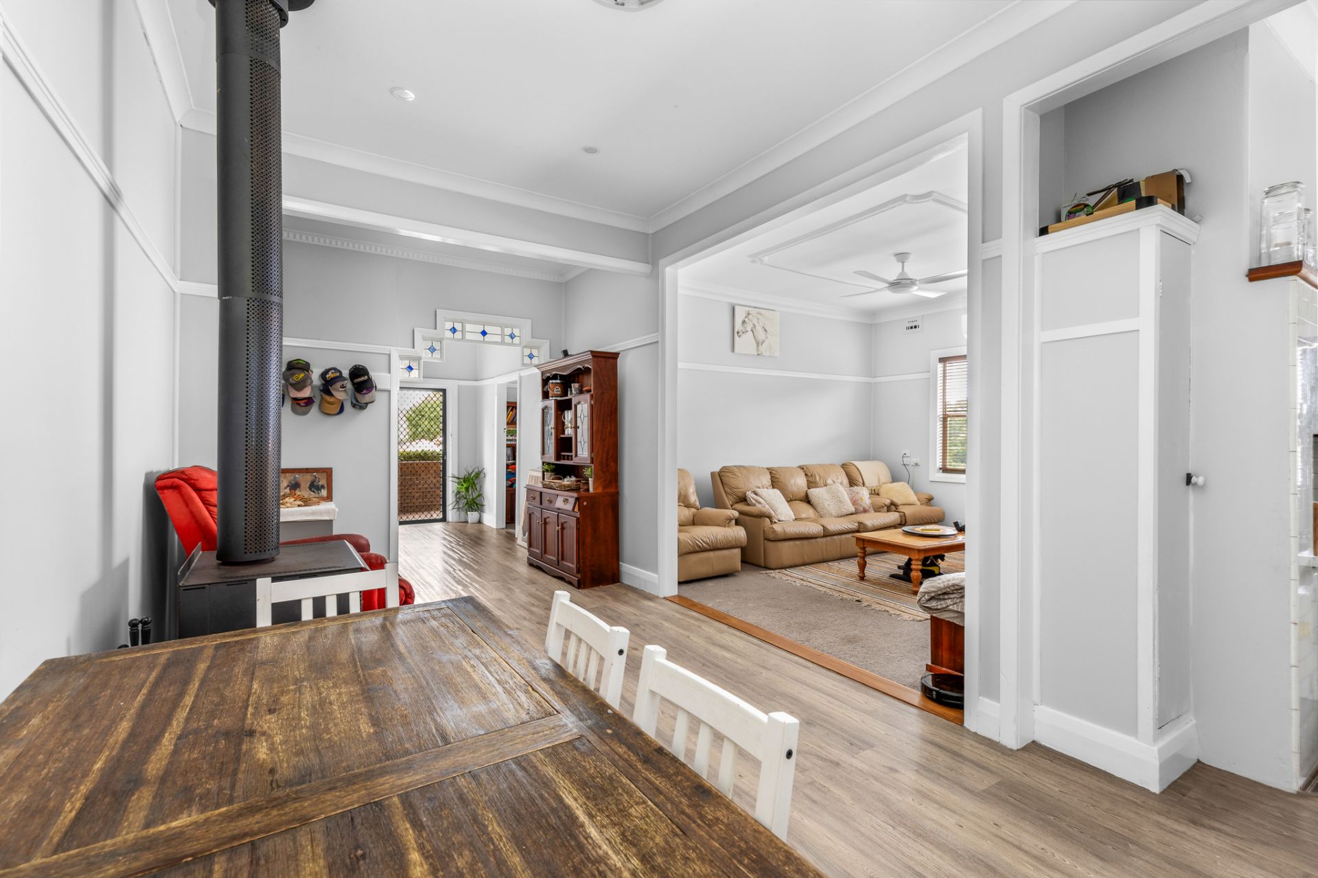 Step inside to find a well kept home offering three bedrooms, all with built in robes and ceiling fans, galley style kitchen with modern finishes, two separate bathrooms, generously sized main living and dining areas complete with a cozy fireplace and a new rip roaring combustion fire taking centre stage. You'll love the soaring high ceilings, detailed cornices, fresh paintwork and easy care vinyl flooring throughout.